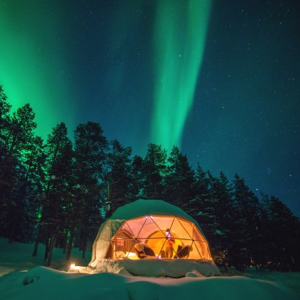 The Aurora Dome is a round igloo-shaped tent with one transparent wall. Experience the Arctic nature up close in Finnish Lapland with the chance of seeing the Northern Lights dancing right above you.