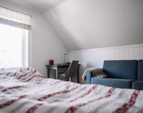 On the ground floor of Trasti & Trine´s lodge you will find a professional kitchen and a cosy dining room. On the upper floor there are two spacious bedrooms. Both have their own private bathroom, but it is located right outside the room. Please note that the shared area outside the rooms consisting of a little tea kitchen and a balcony may be shared with other guests staying in the other room. An organic and home made breakfast is included during your stay.